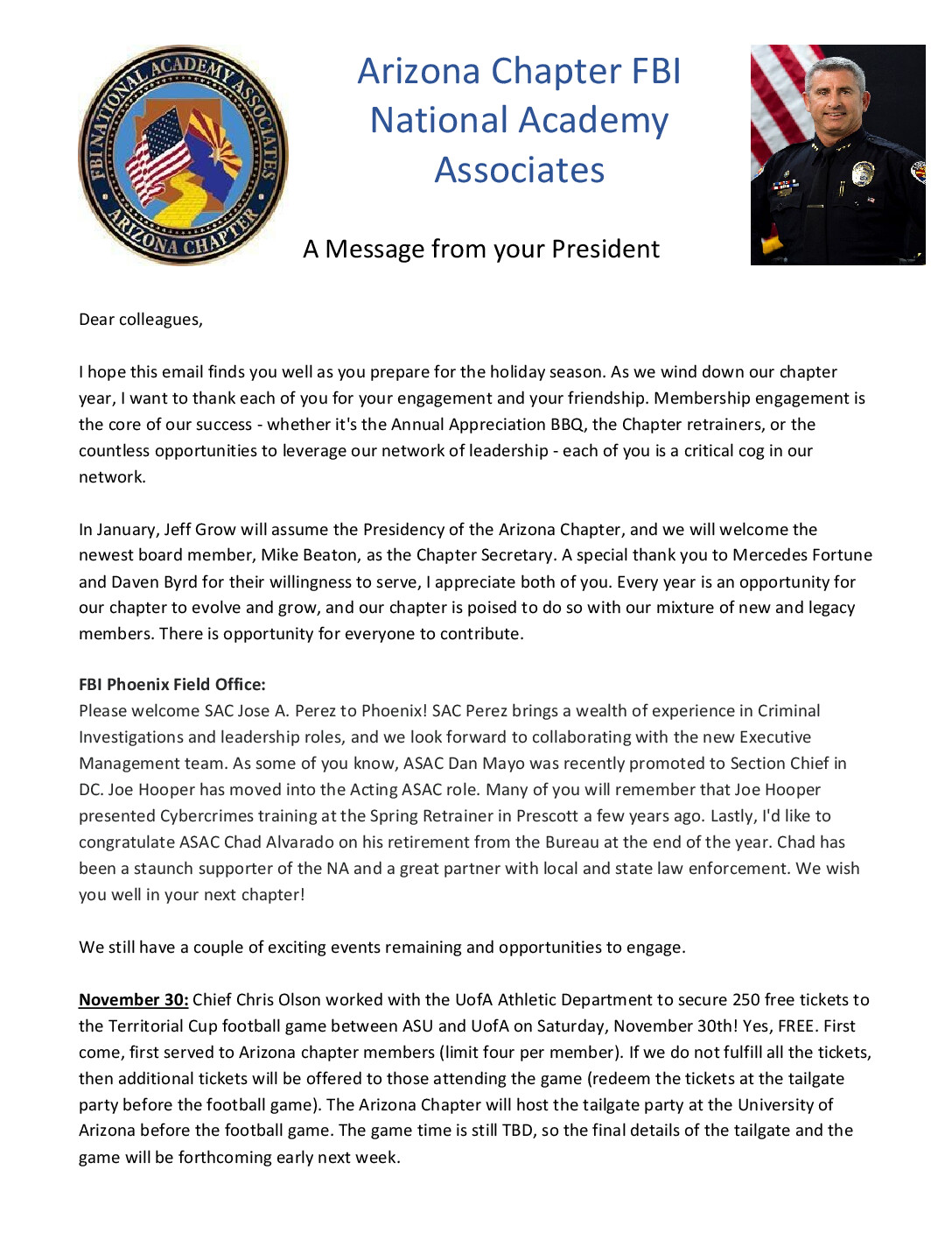 Hello Members and HAPPY NEW YEAR!!! Please let me begin by expressing how excited and honored I am to serve as the FBINAA Arizona Chapter President for 2025. I’d like to thank Past President Bryan Cox for his dedicated service to our chapter in 2024, and my goal is to continue the great work […]